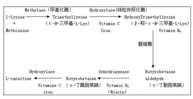 2、生物合成法严格限制在肝、肾组织,还需烟酸、维生素C、维生素B6、Fe2+的参与,其中维生素C对肉碱的合成速度影响最大。合成-分子赖氨酸和三分子蛋氨酸,赖氨酸提供碳链和氮原子,蛋氨酸提供甲基。肌肉组织中肉碱含量虽然高,但要依赖来自肝、肾的血液输送。